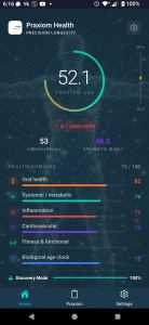 In its Discovery mode, the Praxiom Health Digital Coach helps you build and maintain a strong foundation. It translates biomarker results, medical and dental findings, and lifestyle factors into an understandable profile and clear next steps. You are guided through tiers of testing and assessment, with personalized suggestions on what to address first, how to repeat measurements, and how to track the effect of your actions. When connected to your wearable (Apple Watch, Oura Ring, Garmin, WHOOP, Ultrahuman), Praxiom updates your Vitality sub-score and Pace of Aging weekly — so you see how this week’s sleep, movement, and recovery are shaping your biological trajectory.